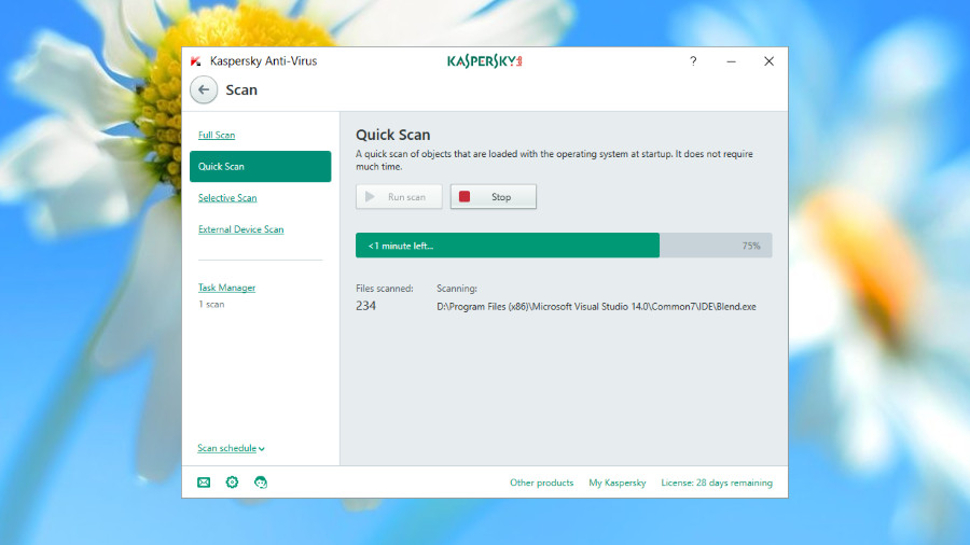 We found scanning times were a little above average – 90 seconds for a Quick Scan, 80 minutes for a Full Scan of our very large test system – but acceptable. Overall we'd describe Kaspersky as thorough rather than slow, as its scans often turned up items that other engines missed; even high-end competitors like Bitdefender.
